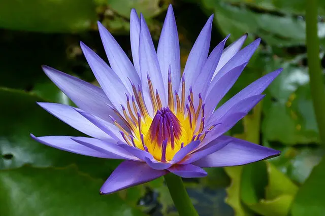 Teratai Api Tidur hanya mekar selama tujuh hari setiap tahunnya. Dibungkus oleh kelopak ungu, bunga ini memiliki sulur-sulur keemasan di tengahnya, membungkus kuncup yang hanya terbuka sesaat sebelum layu. Ada yang mengatakan bahwa sulur-sulur emas tersebut berfungsi untuk melindungi kuncup, sehingga memungkinkannya untuk 'tidur' dengan tenang, oleh karena itu dinamakan "Teratai Api Tidur". Tanaman ini tumbuh subur di bawah sinar matahari yang melimpah, lokasi yang berventilasi baik, tanah berpasir yang subur, air bersih, dan air hangat yang tenang. Setiap musim semi, ia bertunas dan tumbuh; di musim panas, ia berbunga. Setelah berbunga, buahnya terendam di dalam air, melepaskan biji setelah matang.