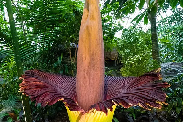 Titan Arum, juga dikenal sebagai "Bunga Mayat" atau "Titan Arum", termasuk dalam keluarga Araceae dan genus Amorphophallus. Saat mekar, bunga ini memancarkan aroma yang mirip dengan mayat yang membusuk, sehingga mendapat julukan "bunga paling bau di dunia." Umbi Titan Arum dapat mencapai diameter 65 sentimeter dan berat lebih dari 100 kilogram; tangkai daunnya biasanya setinggi 3-4 meter, dengan diameter bilah daun melebihi 5 meter dan mencakup area lebih dari 20 meter persegi. Titan Arum liar tumbuh secara eksklusif di hutan hujan tropis Sumatera, Indonesia. Bunga ini mekar hanya dua atau tiga kali seumur hidupnya, dengan setiap periode pembungaan yang singkat, paling lama hanya beberapa hari. Setelah berbuah, bunga ini akan layu dengan cepat.